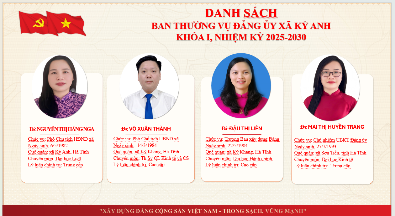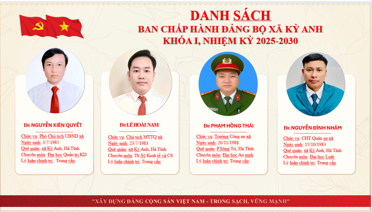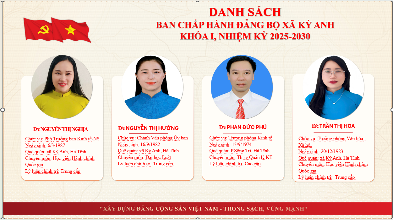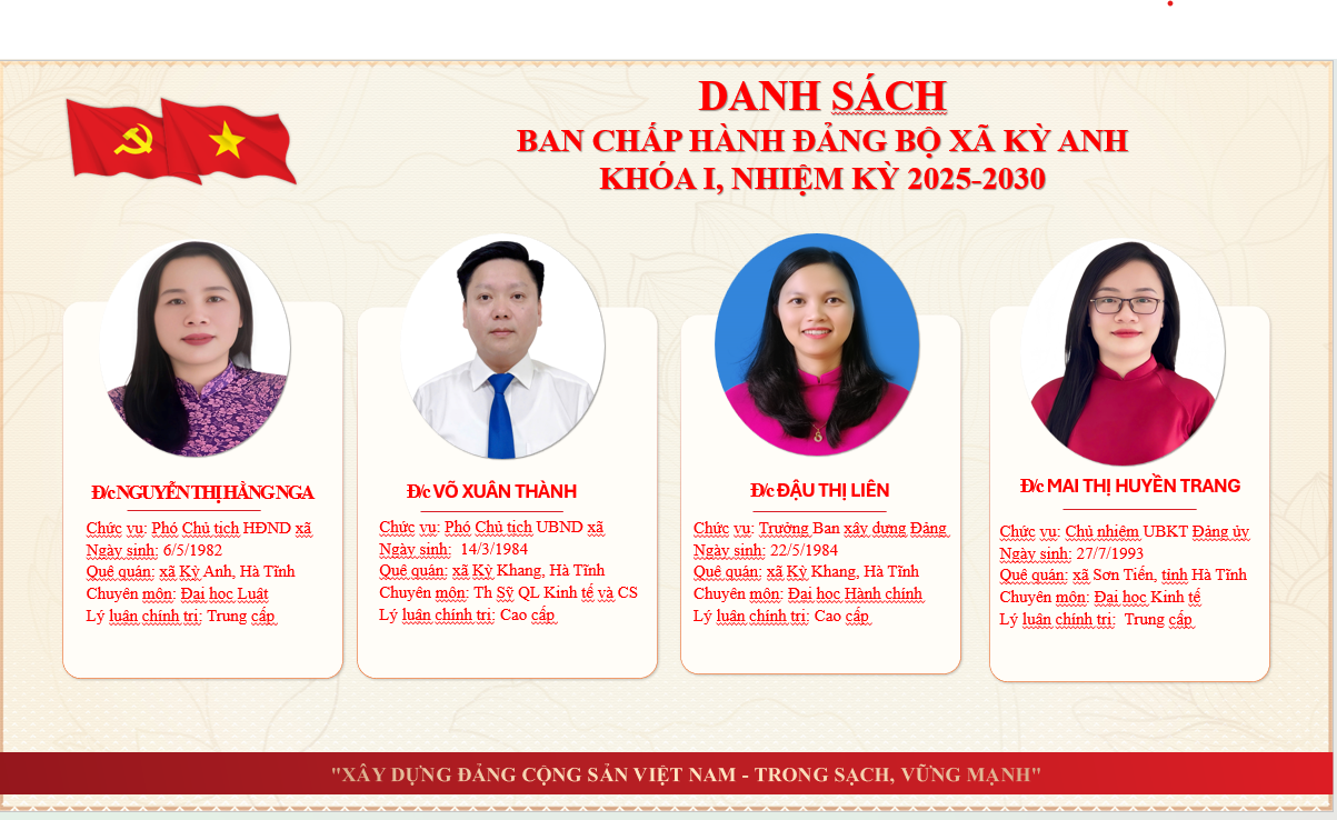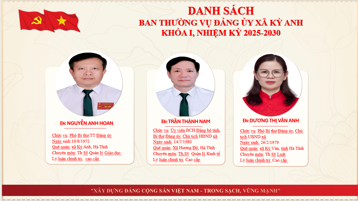 Thông tin về lãnh đạoẨn danh01/07/2025A -A+Thông tin về lãnh đạo xã Kỳ Anh tỉnh Hà Tĩnh THÔNG TIN THƯỜNG TRỰC, BAN THƯỜNG VỤ, BAN CHẤP HÀNH ĐẢNG BỘ XÃ KỲ ANH