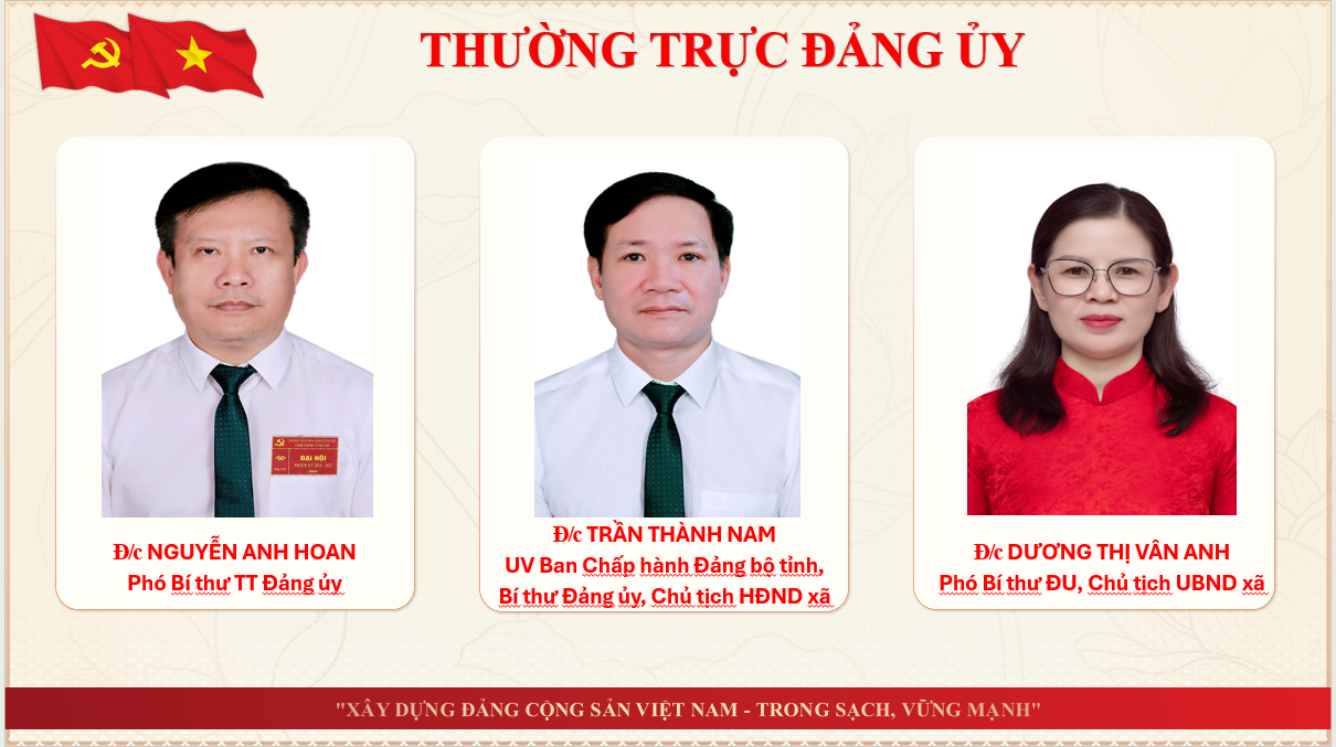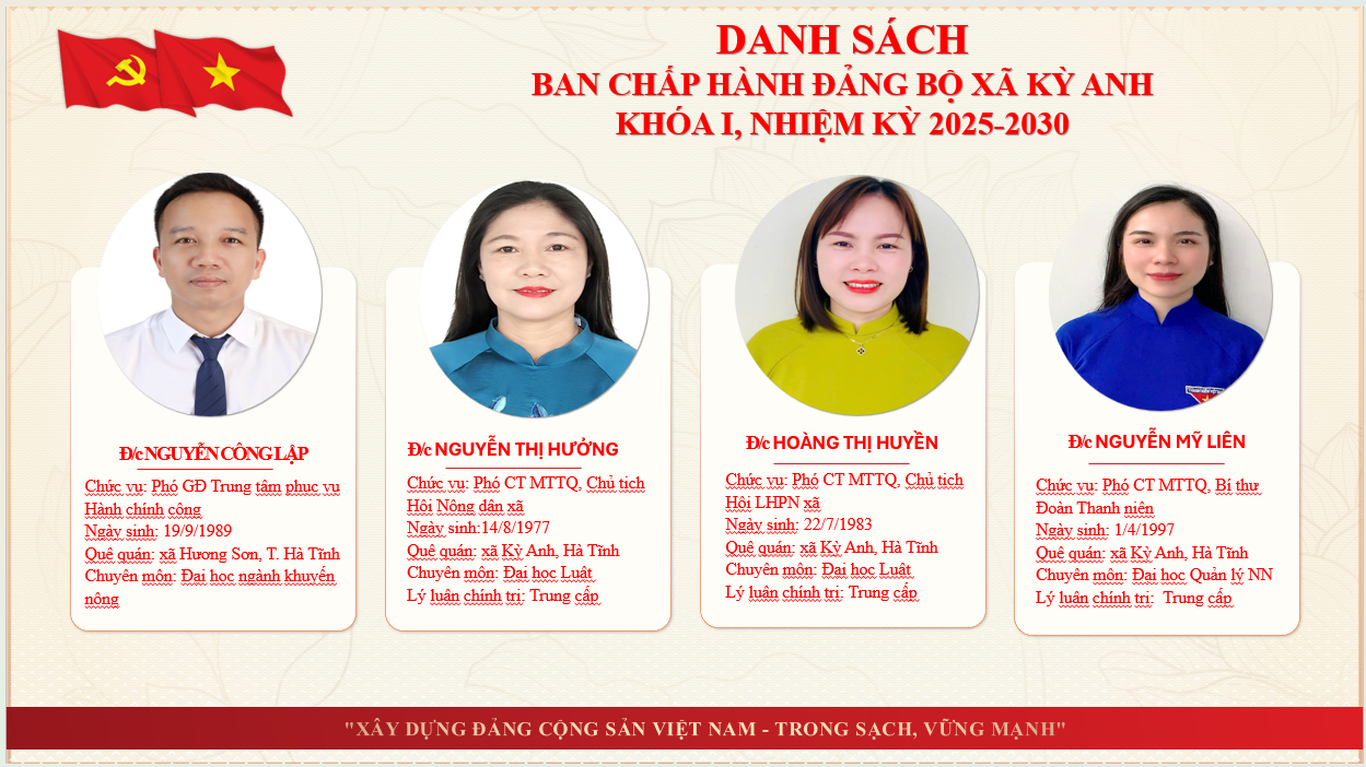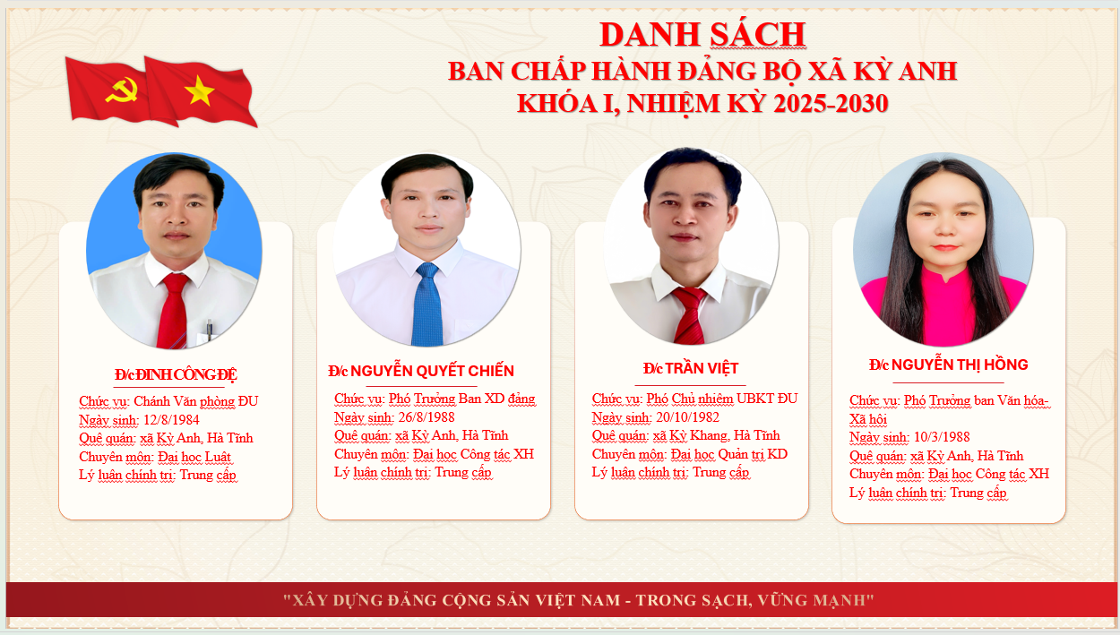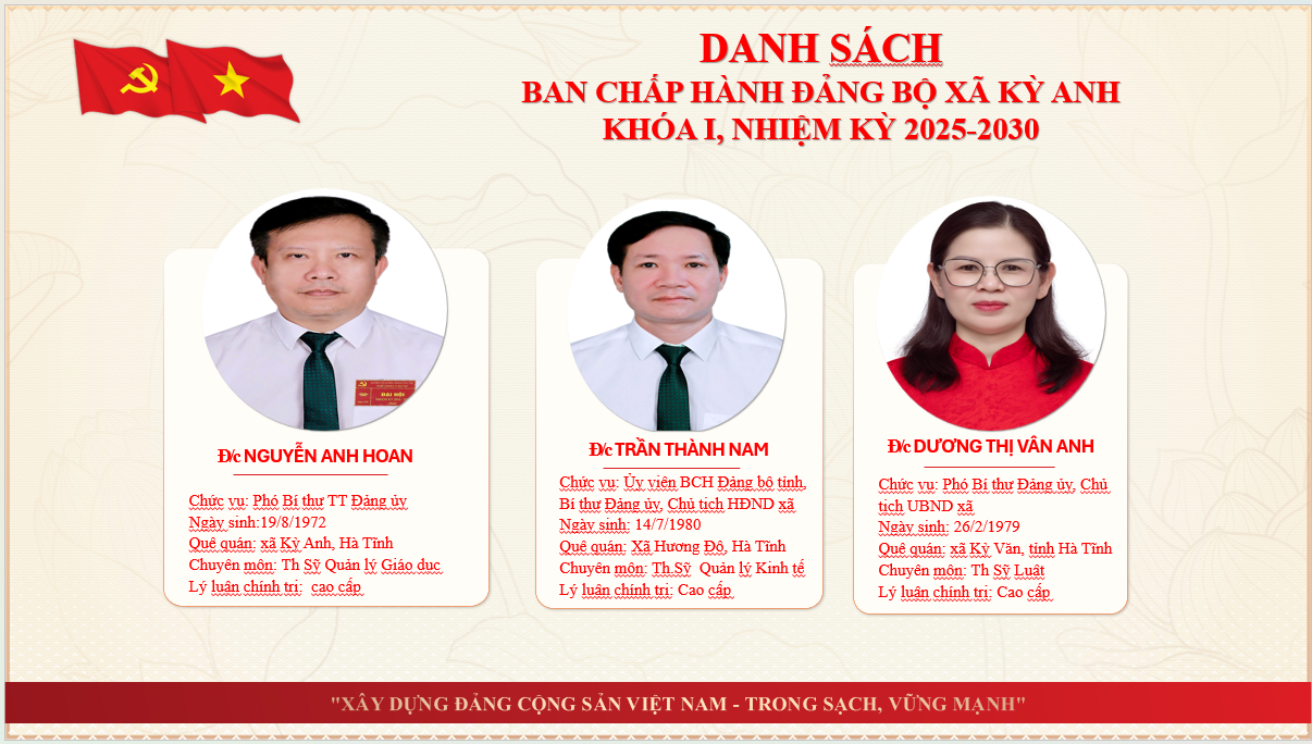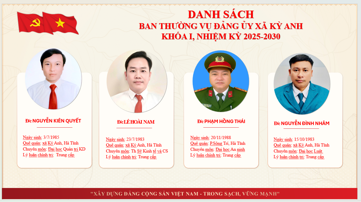Thông tin về lãnh đạoẨn danh01/07/2025A -A+Thông tin về lãnh đạo xã Kỳ Anh tỉnh Hà Tĩnh THÔNG TIN THƯỜNG TRỰC, BAN THƯỜNG VỤ, BAN CHẤP HÀNH ĐẢNG BỘ XÃ KỲ ANH