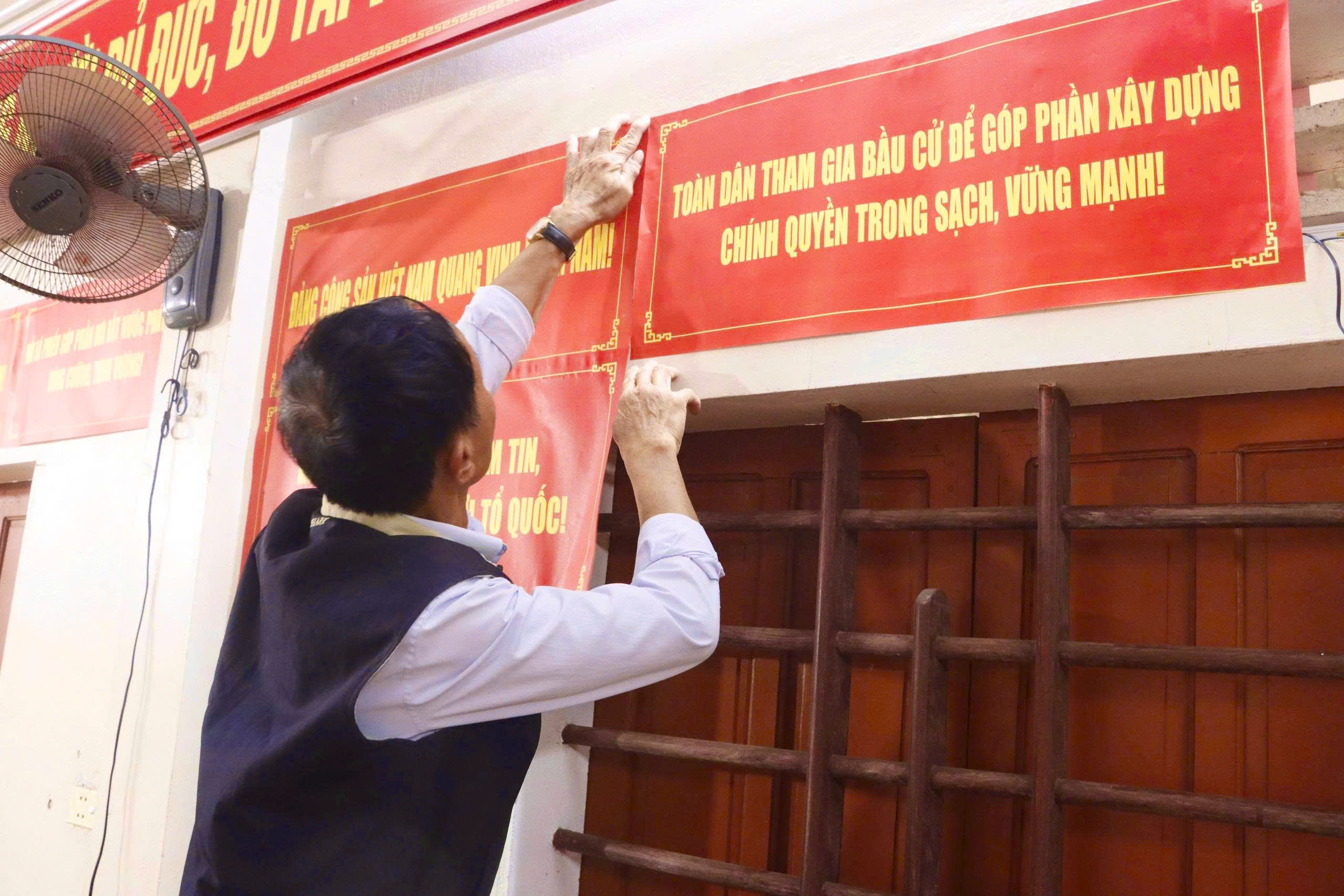 Các thành viên Tổ bầu cử vẫn đang tất bất kiểm tra lại công tác trang trí dù là khâu nhỏ nhất