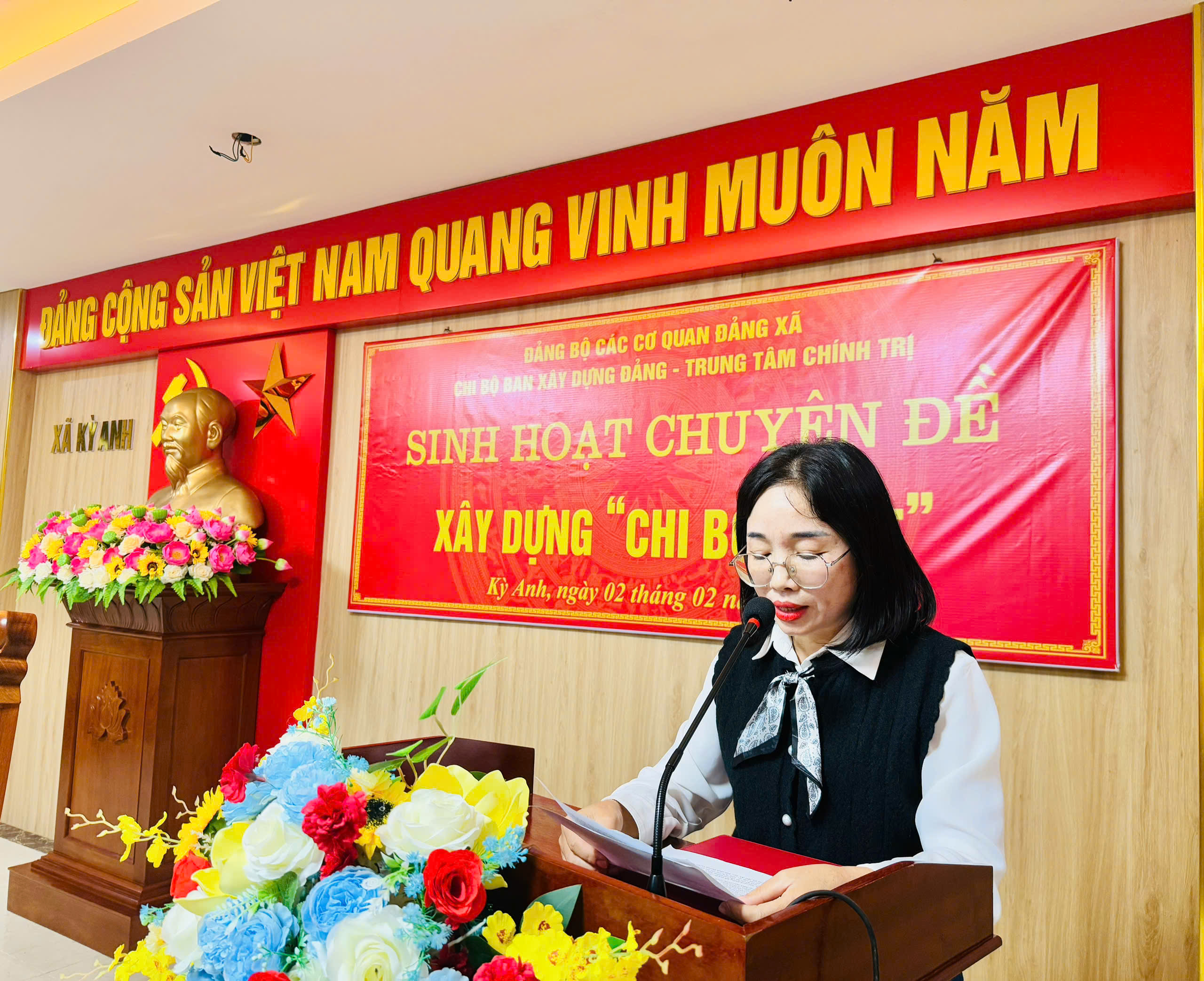 Đồng chí Đậu Thị Liên, Bí thư Chi bộ đã ghi nhận và đánh giá cao việc chủ động học tập, nghiên cứu, chuẩn bị nội dung, Báo cáo trung tâm sinh hoạt chuyên đề của Chi bộ, đồng thời định hướng, gợi mở và làm rõ thêm một số nội dung giúp các đảng viên trong Chi bộ nhận thức, xác định đúng vấn đề tập trung phân tích thảo luận, nội dung, tiêu chí xây dựng “Chi bộ 4 tốt” gắn với nhiệm vụ chính trị của Chi bộ, của từng đảng viên. Trên cơ sở đó, đánh giá kết quả thực hiện các nhiệm vụ xây dựng “Chi bộ 4 tốt” trong thời gian qua.