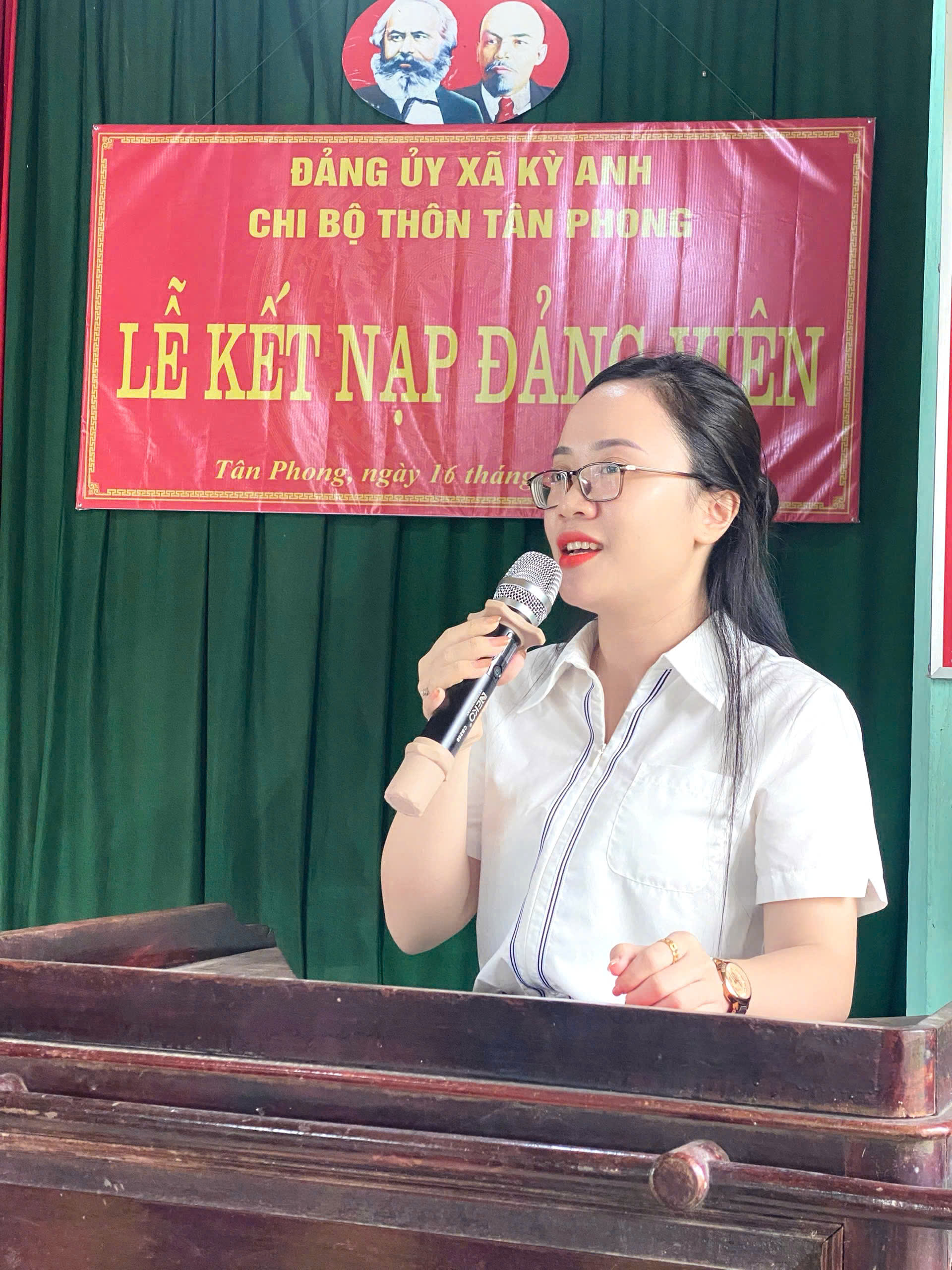 Dưới cờ Đảng quang vinh, Quốc kỳ thiêng liêng và chân dung Chủ tịch Hồ Chí Minh vĩ đại, đồng chí Trần Thị Hợp đã đọc lời tuyên thệ của người đảng viên, nguyện trung thành tuyệt đối với lý tưởng cách mạng của Đảng, không ngừng tu dưỡng, rèn luyện, phấn đấu, góp phần xây dựng Chi bộ ngày càng trong sạch, vững mạnh.