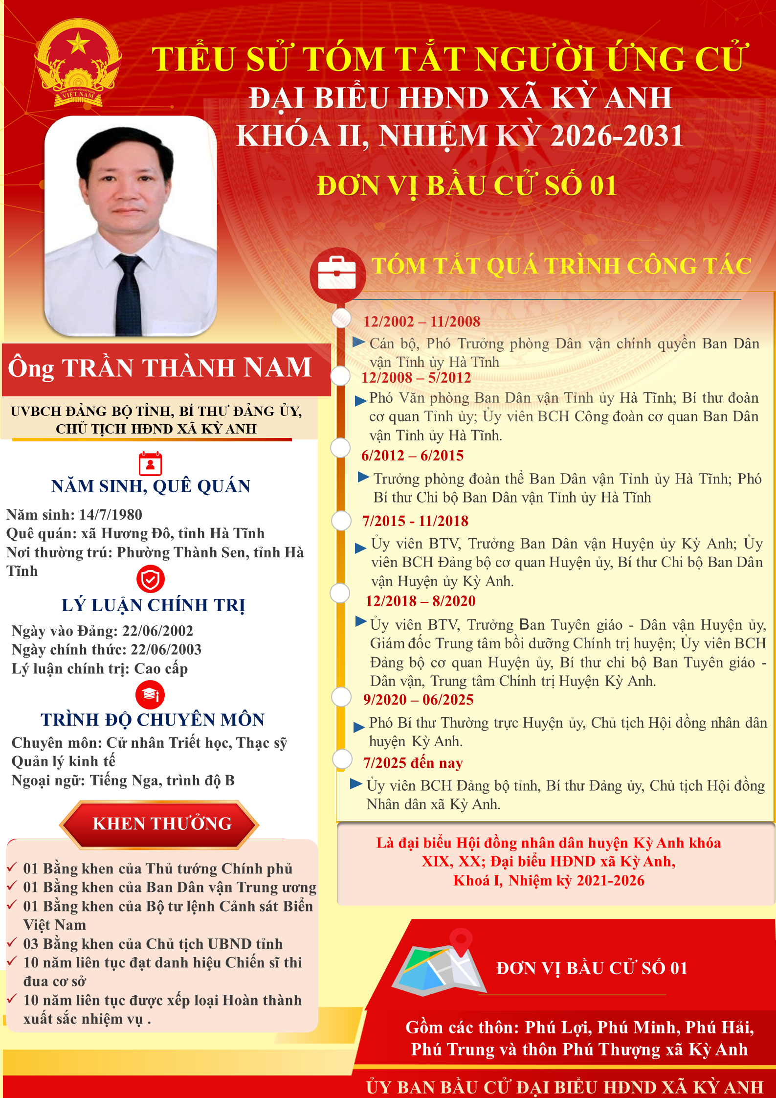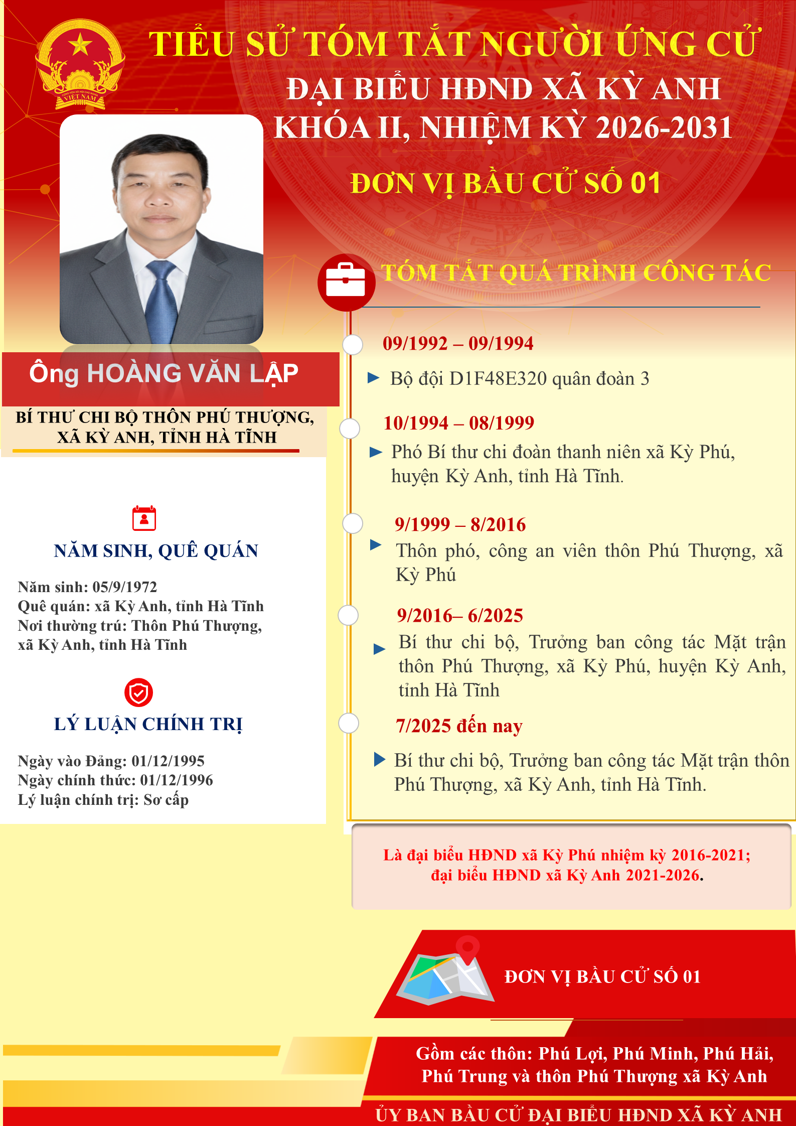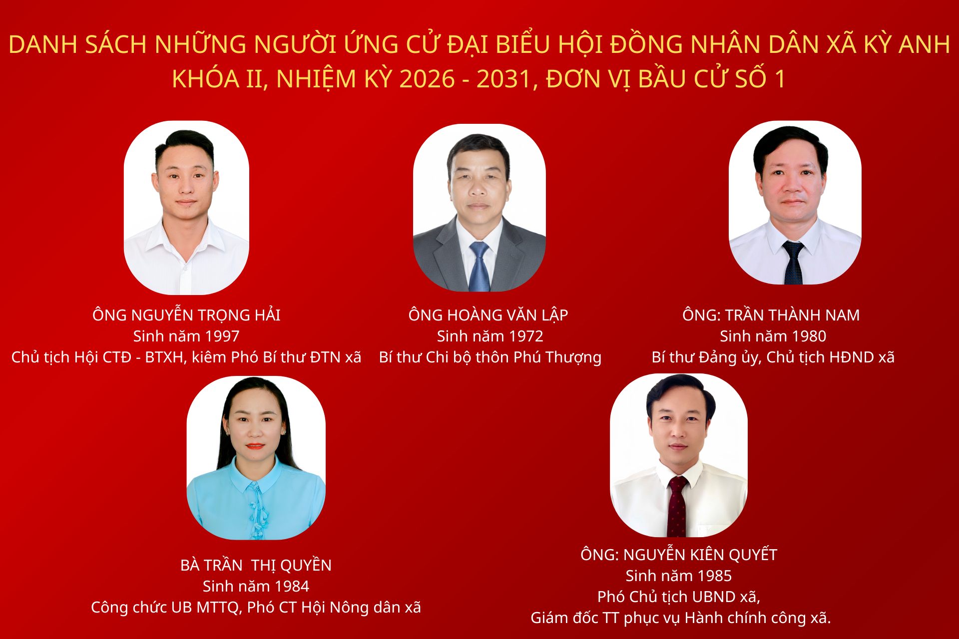 Tiểu sử tóm tắt của các ứng cử viên đại biểu Hội đồng nhân dân xã Kỳ Anh khóa II, nhiệm kỳ 2026 - 2031 đã được niêm yết công khai tại các nhà văn hóa thôn để cử tri tiện theo dõi. Kính mong cử tri, quan tâm đến xem, tìm hiểu và nghiên cứu trước khi tham gia bầu cử.