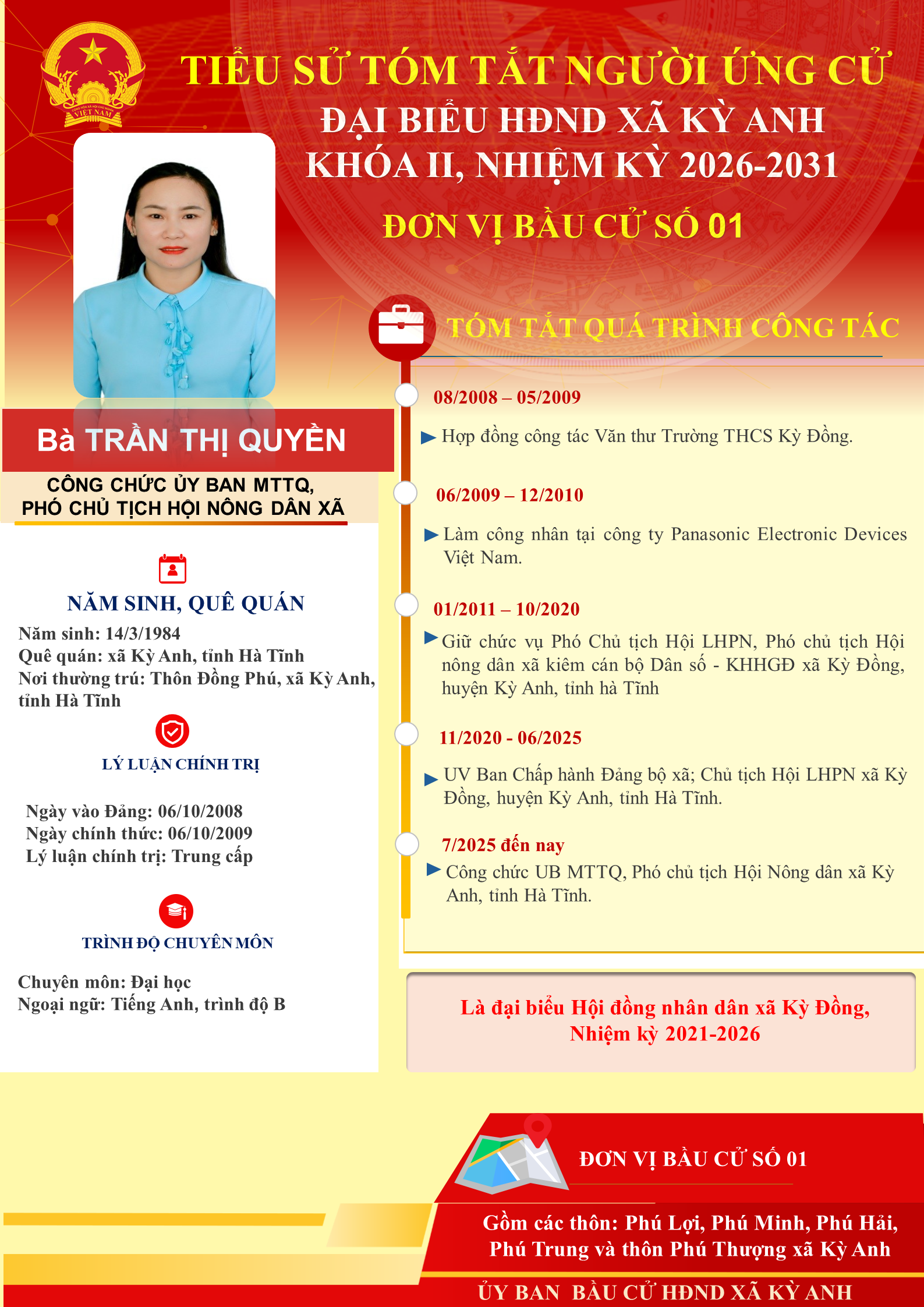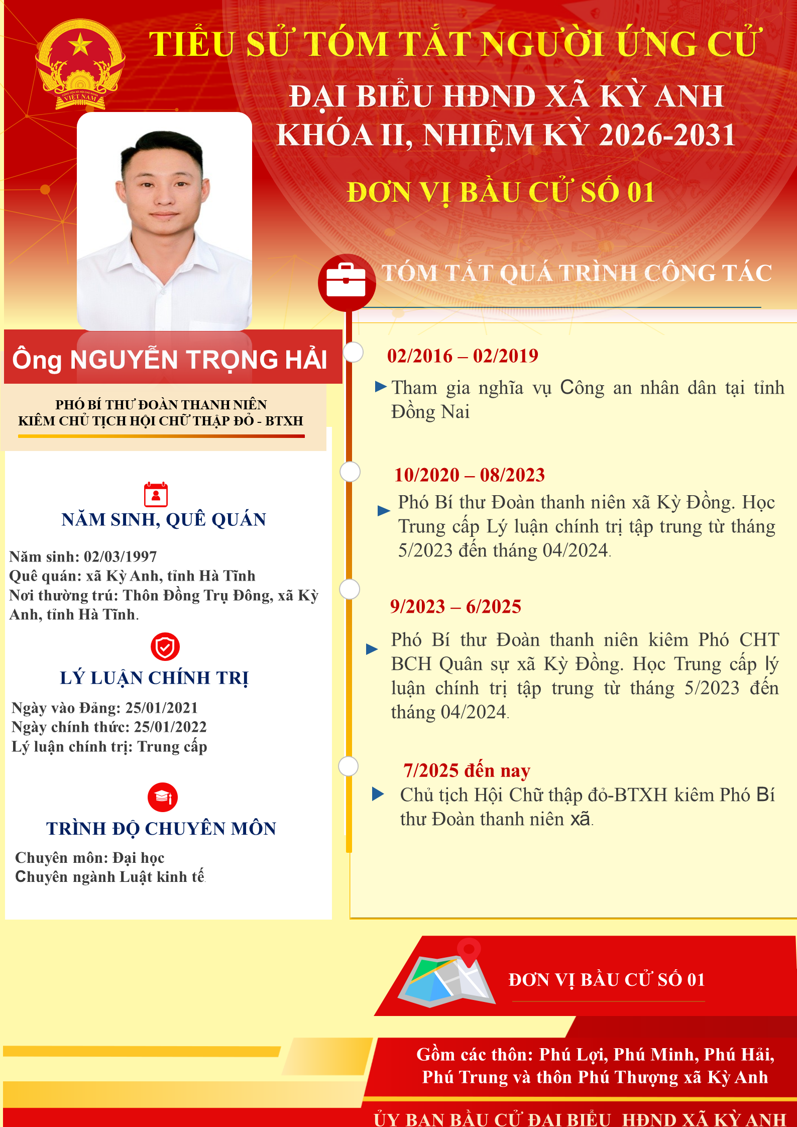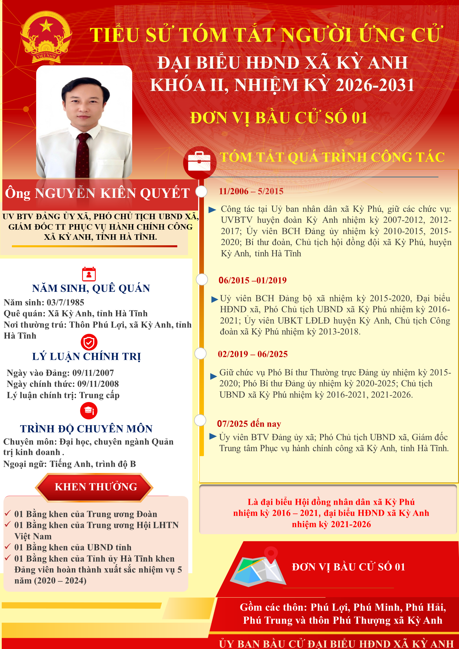 Tiểu sử tóm tắt của các ứng cử viên đại biểu Hội đồng nhân dân xã Kỳ Anh khóa II, nhiệm kỳ 2026 - 2031 đã được niêm yết công khai tại các nhà văn hóa thôn để cử tri tiện theo dõi. Kính mong cử tri, quan tâm đến xem, tìm hiểu và nghiên cứu trước khi tham gia bầu cử.