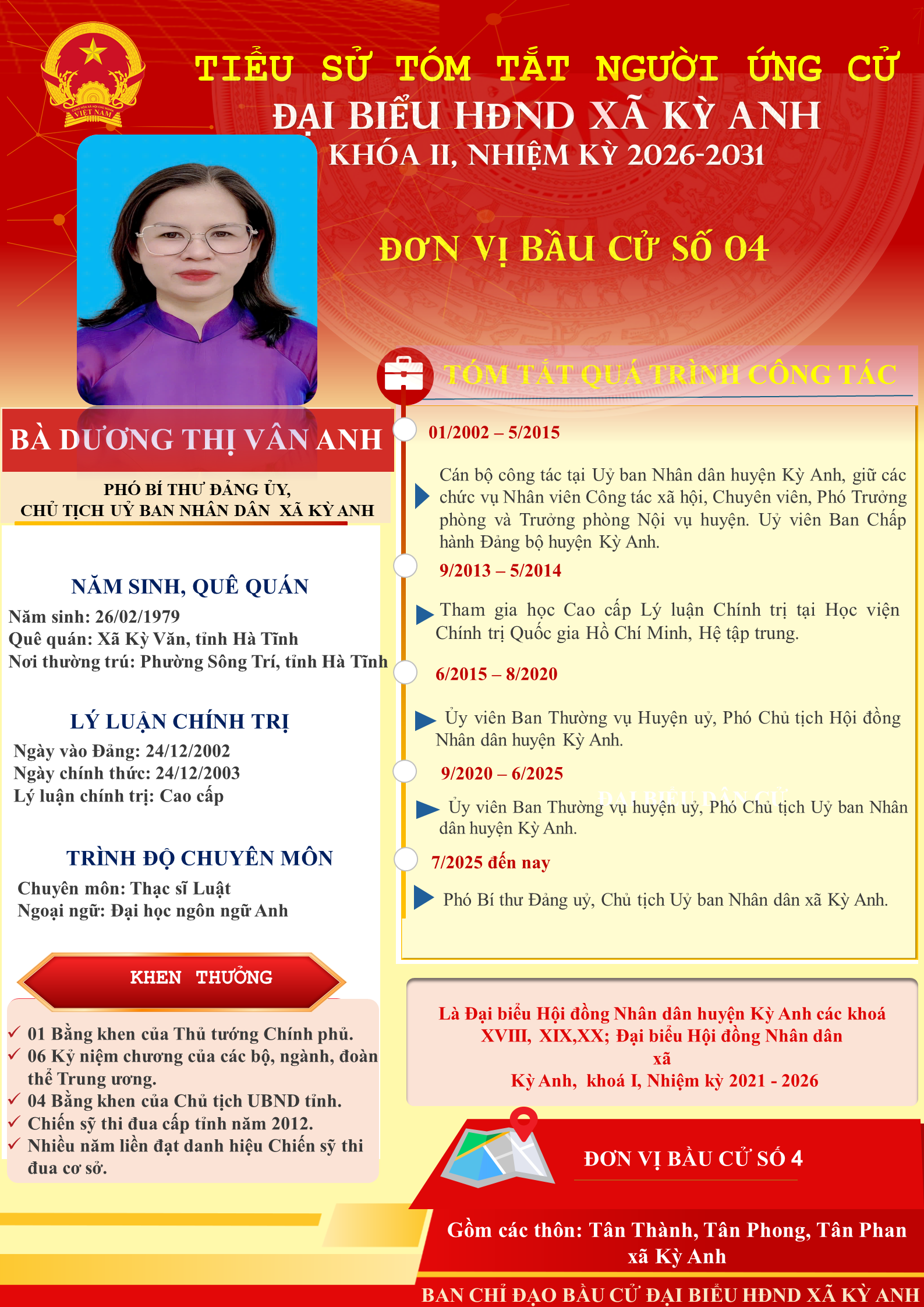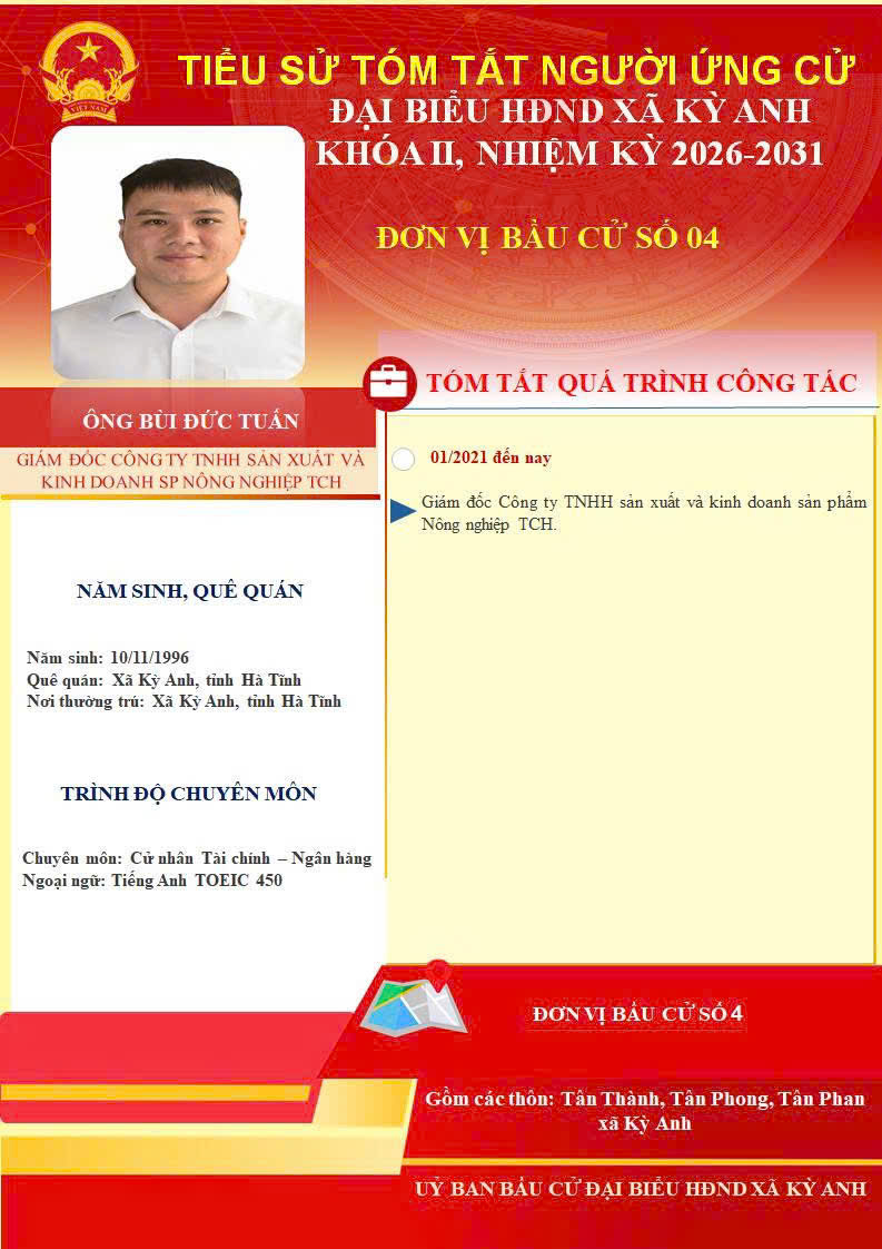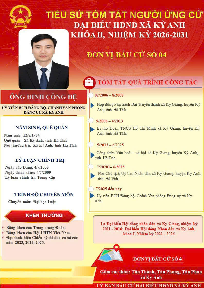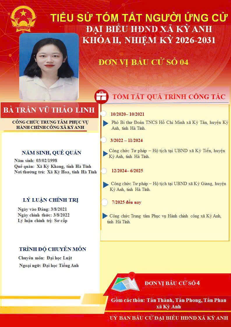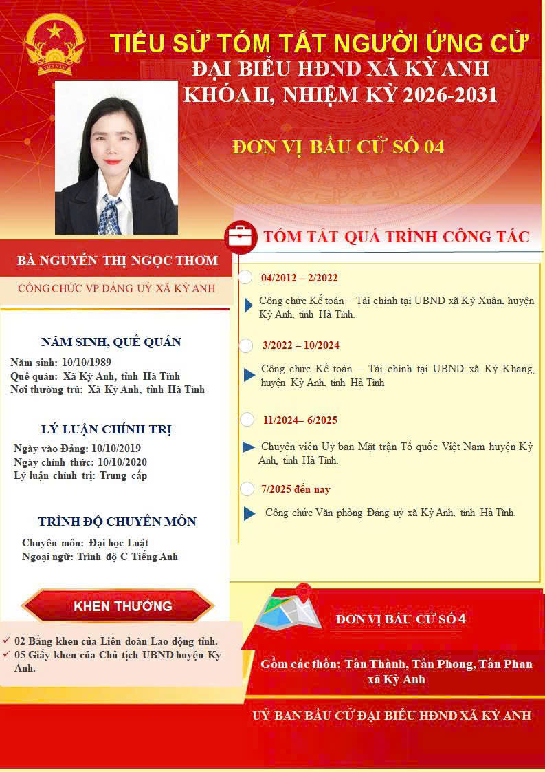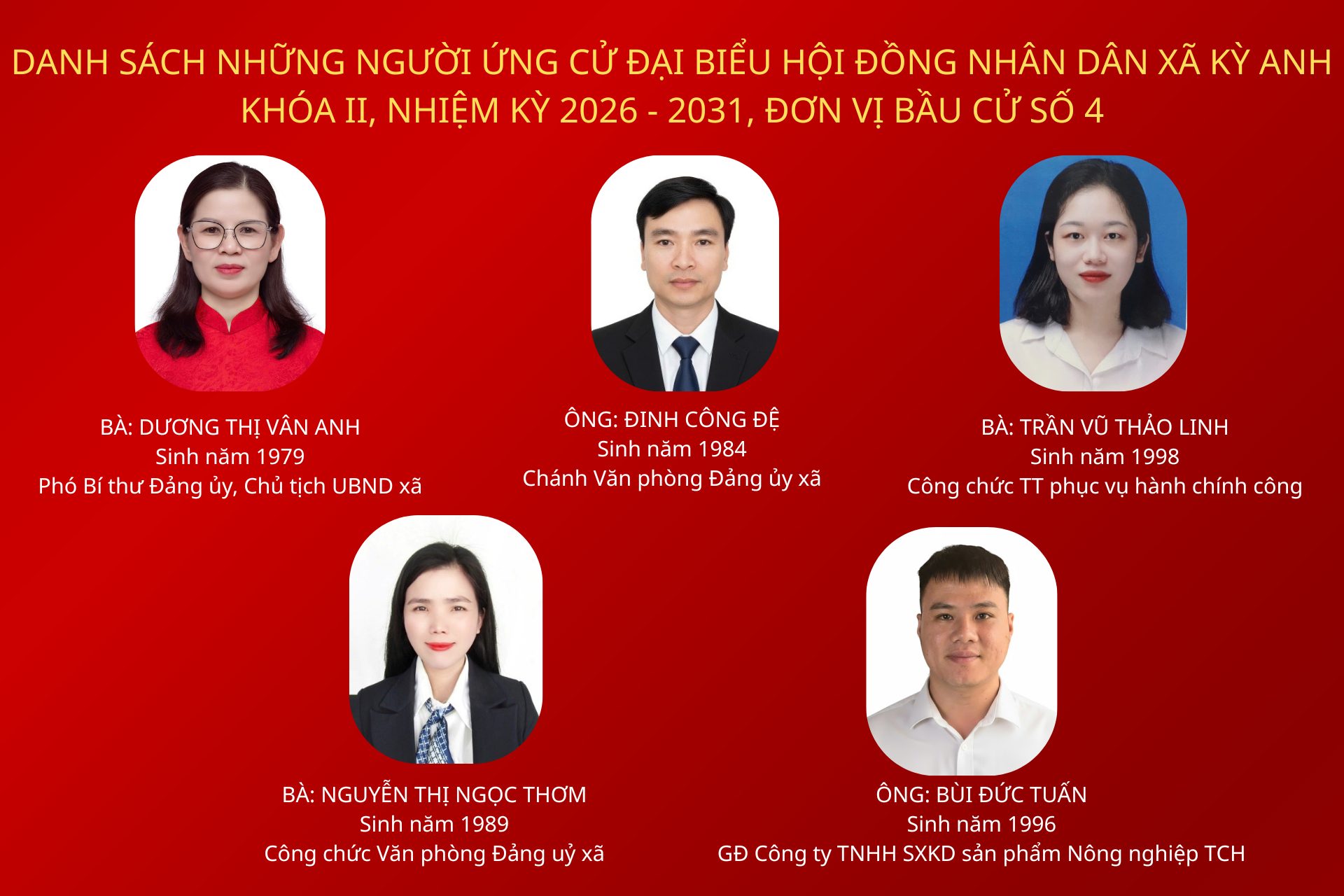 Tiểu sử tóm tắt của các ứng cử viên đại biểu Hội đồng nhân dân xã Kỳ Anh khóa II, nhiệm kỳ 2026 - 2031 đã được niêm yết công khai tại các nhà văn hóa thôn để cử tri tiện theo dõi. Kính mong cử tri, quan tâm đến xem, tìm hiểu và nghiên cứu trước khi tham gia bầu cử.