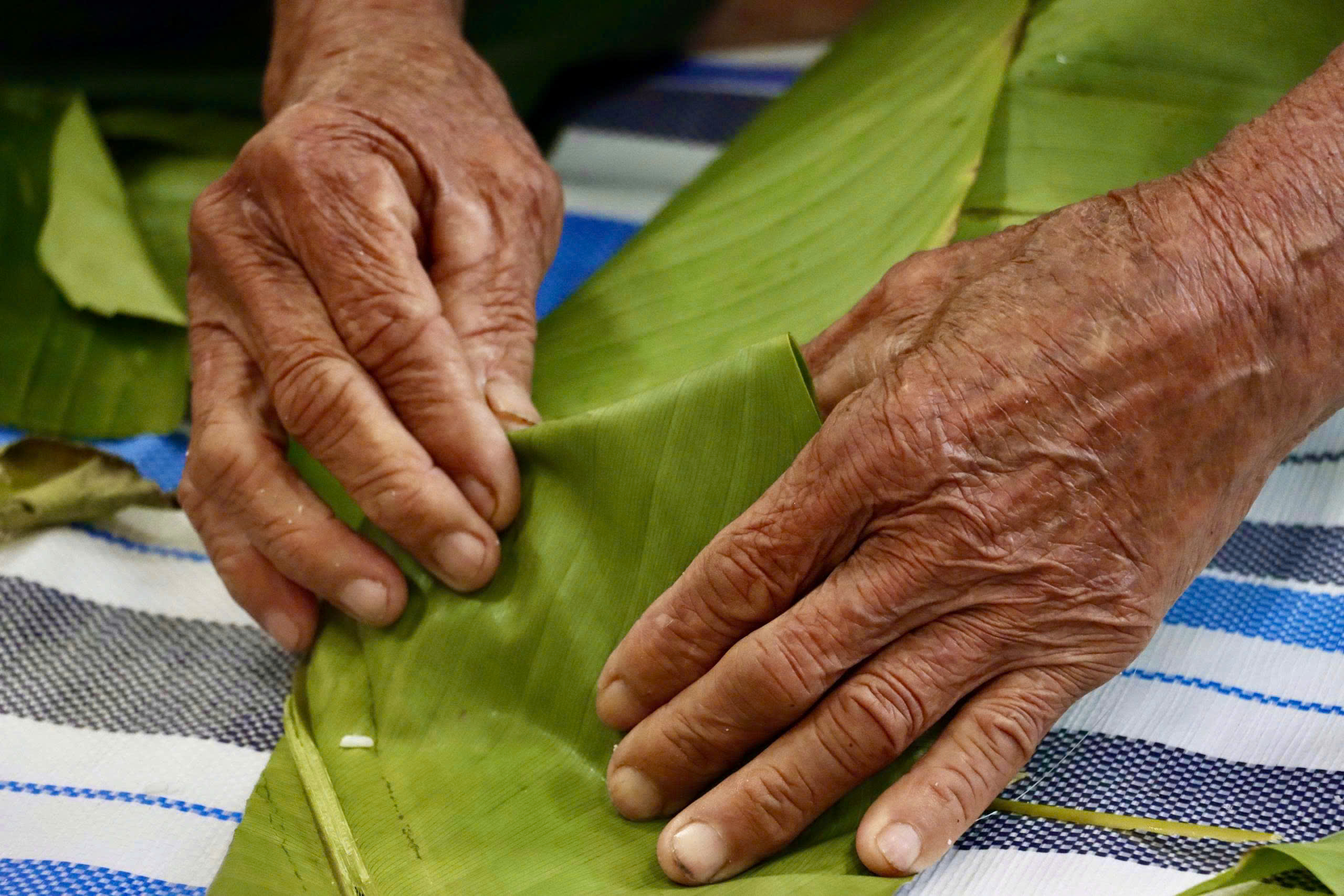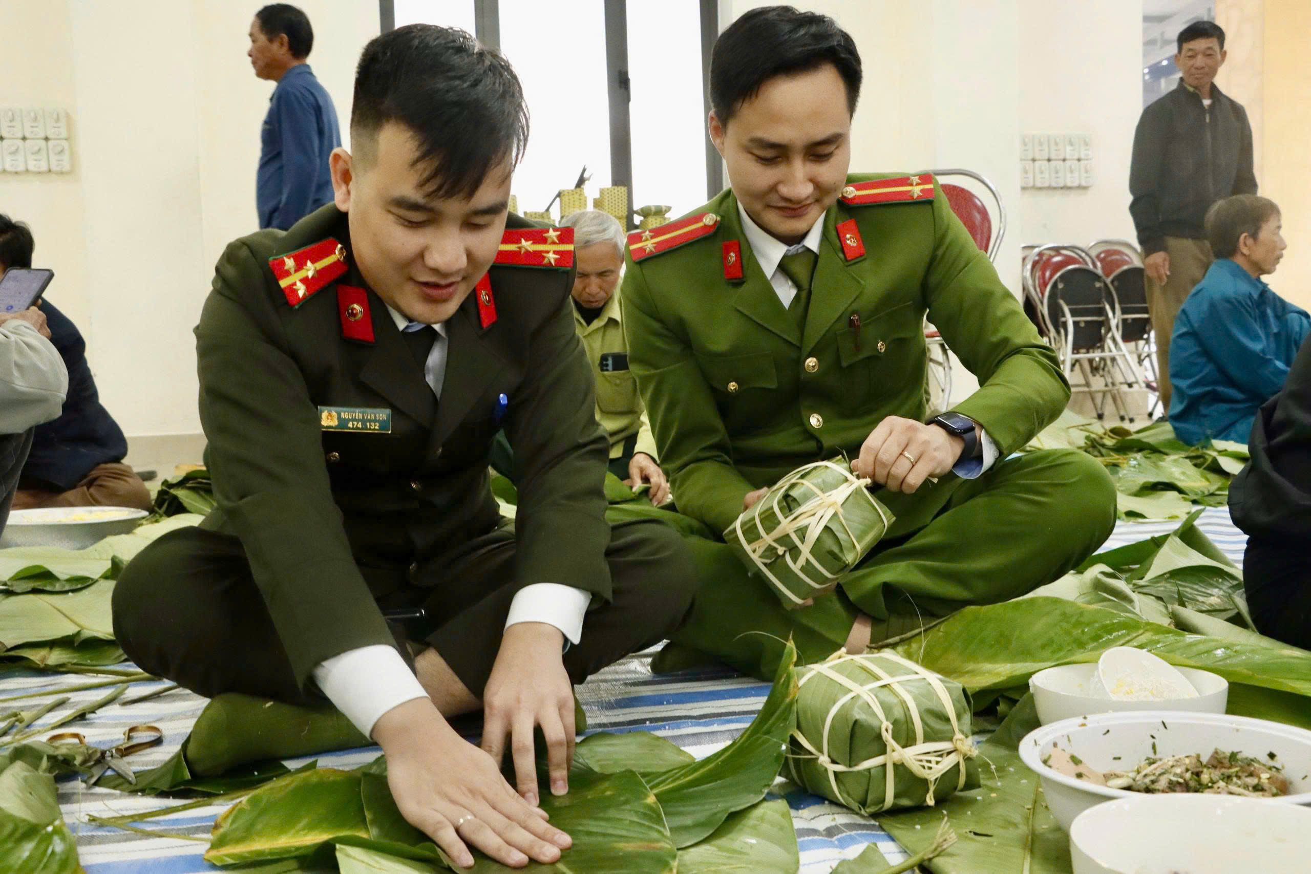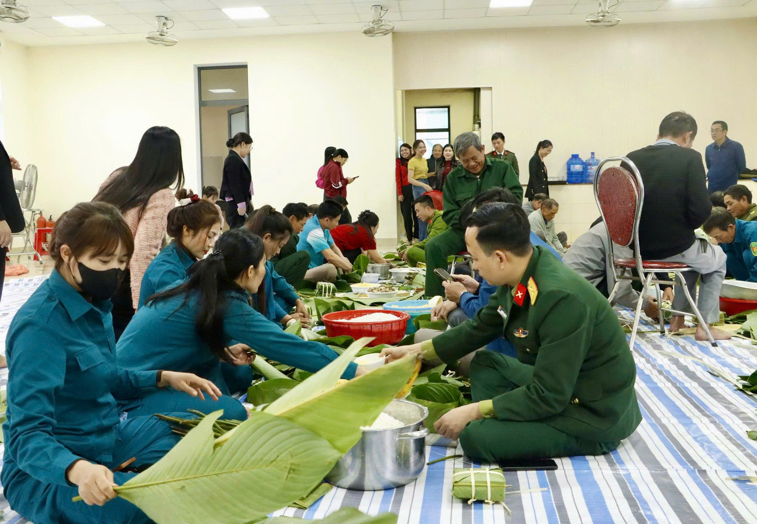 Ngay từ sáng sớm, các đồng chí cán bộ, công chức, viên chức cùng các chiến sĩ Công an, Ban chỉ huy Quân sự xã đã cùng nhau mỗi người một tay, từ khâu vo nếp, rửa lá dong đến gói bánh.