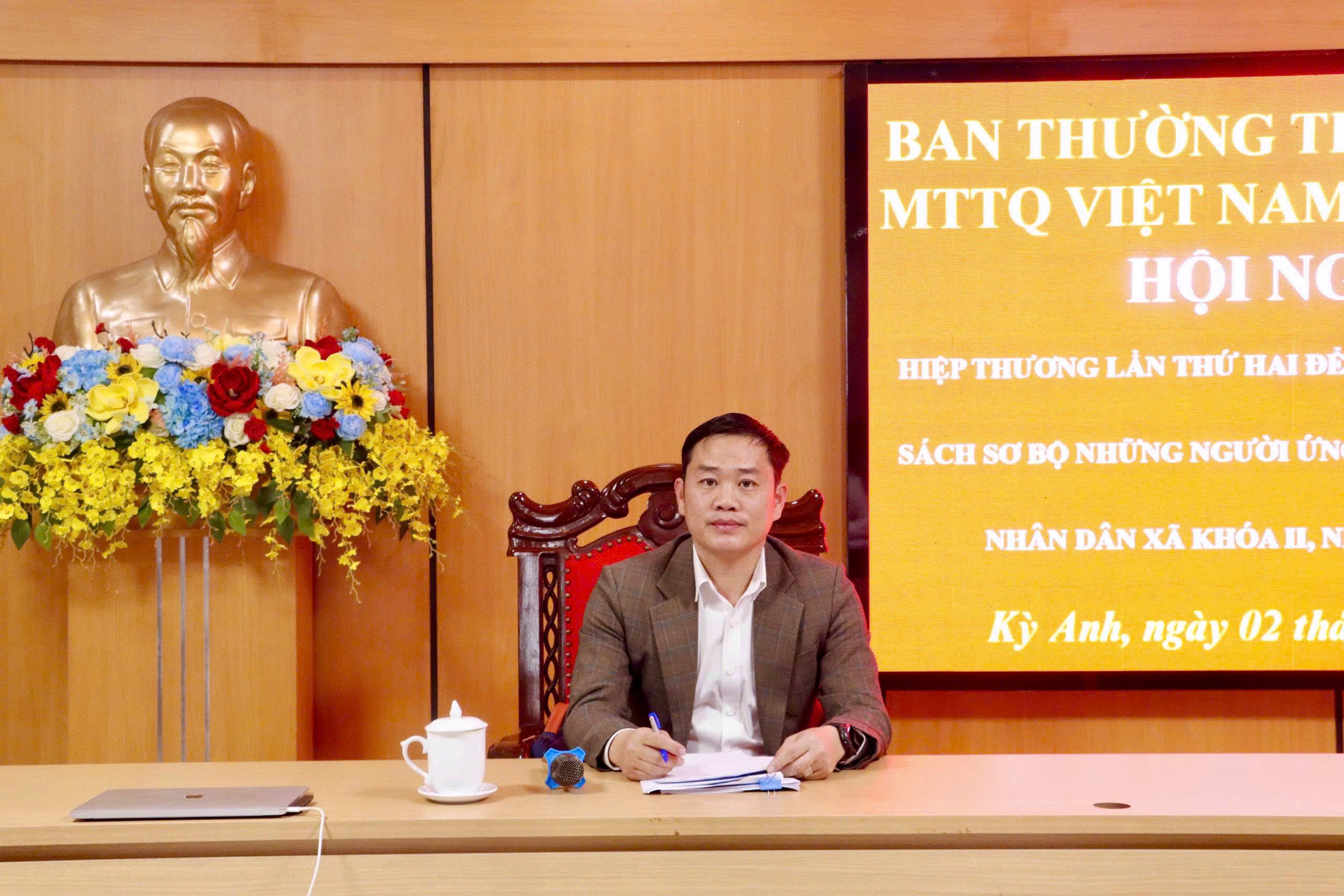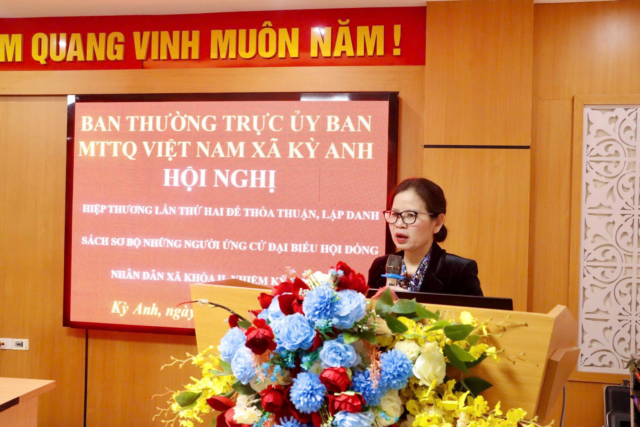 Tại hội nghị, Ban Thường trực UBMTTQ Việt Nam xã đã báo cáo tình hình giới thiệu người ứng cử của các cơ quan, tổ chức, đơn vị, thôn. Hội nghị đã tập trung thảo luận về tình hình giới thiệu người ứng cử của các cơ quan, đơn vị, tổ chức và thôn; xem xét danh sách sơ bộ những người được các cơ quan, tổ chức, đơn vị, thôn giới thiệu ứng cử. Các ý kiến tham gia tại Hội nghị đều thể hiện tinh thần trách nhiệm cao, tập trung đánh giá về tiêu chuẩn, điều kiện, cơ cấu, thành phần, số lượng người được giới thiệu ứng cử theo đúng quy định của pháp luật. Hội nghị đã thống nhất cao về danh sách sơ bộ những người được giới thiệu ứng cử gồm có 44 vị, đảm bảo đúng tiêu chuẩn đại biểu, phù hợp với cơ cấu, thành phần, tỷ lệ theo quy định; đồng thời bảo đảm tính kế thừa, đại diện và phát huy vai trò của các tầng lớp Nhân dân.