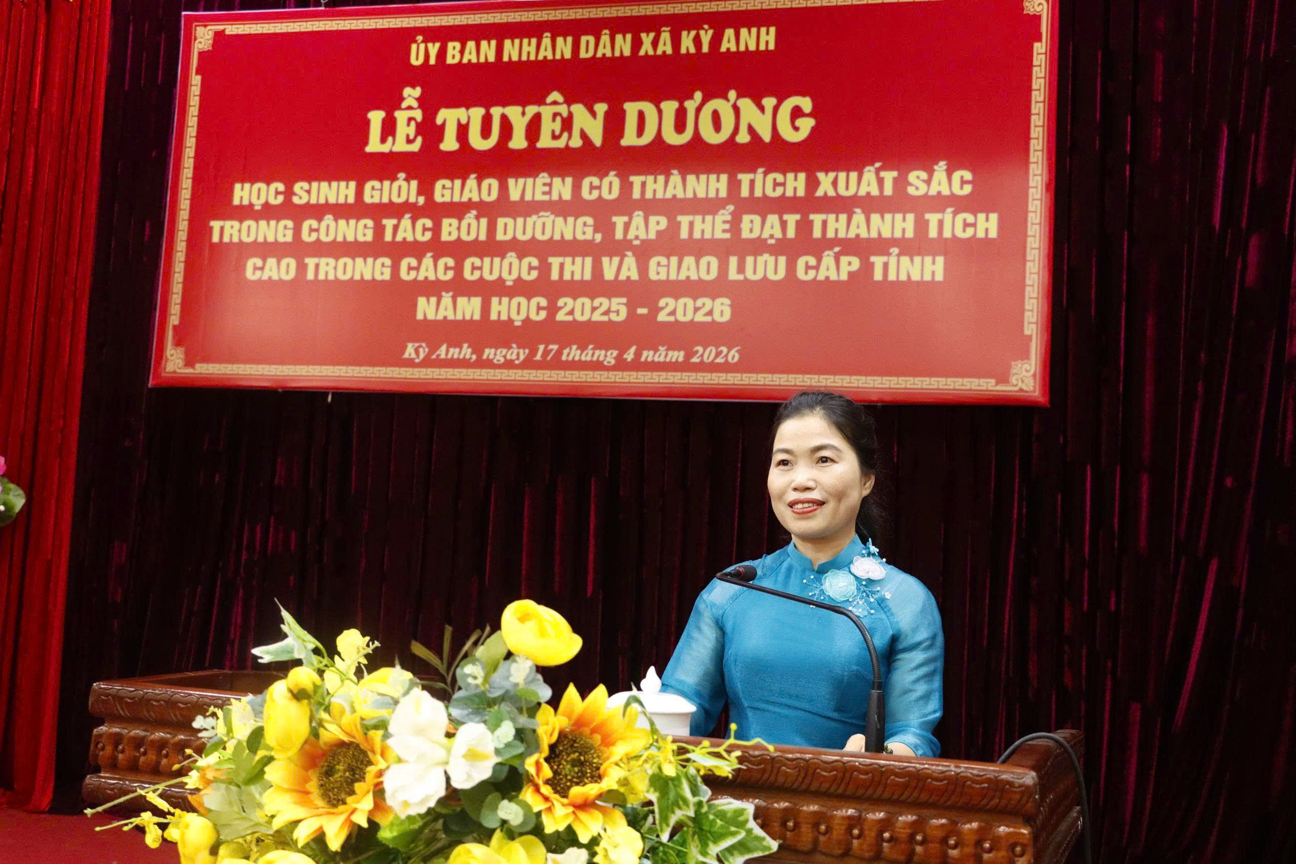 Tại buổi lễ, đồng chí Hoàng Nữ Thanh Huyền – Phó Trưởng Phòng Văn hóa – Xã hội đã trình bày báo cáo công tác bồi dưỡng học sinh giỏi năm học 2025–2026. Báo cáo nêu rõ: năm học 2025–2026 là năm đầu tiên triển khai mô hình chính quyền địa phương 2 cấp, công tác giáo dục, đặc biệt là giáo dục mũi nhọn đứng trước nhiều yêu cầu mới. Với sự quan tâm lãnh đạo, chỉ đạo sát sao của cấp ủy, chính quyền và sự nỗ lực của toàn ngành, công tác bồi dưỡng học sinh giỏi trên địa bàn xã đã từng bước đi vào nền nếp, đạt được những kết quả tích cực.
