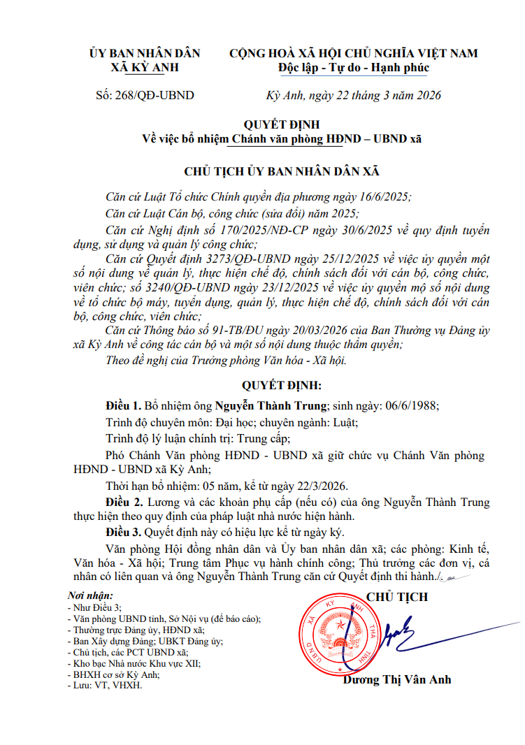 Quyết định về việc bổ nhiệm Chánh văn phòng HĐND – UBND xã (Nguyễn Thành Trung)Hoa Phượng24/03/2026A -A+Hoa Phượng24/03/2026A -A+ File đính kèm268.QD-bo-nhiem-Nguyen-Thanh-Trung-454(24.03.2026_16h07p02)_signed.pdf