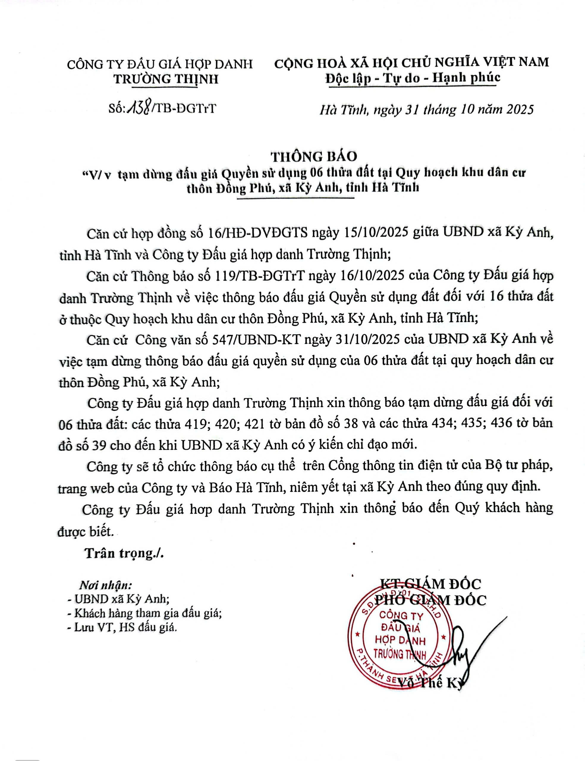 Thông báo về việc tạm dừng Đấu giá quyền sử dụng 06 thửa đất tại Quy hoạch khu dân cư thôn Đồng Phú, xã Kỳ Anh, tỉnh Hà TĩnhPhòng Kinh tế31/10/2025A -A+Phòng Kinh tế31/10/2025A -A+