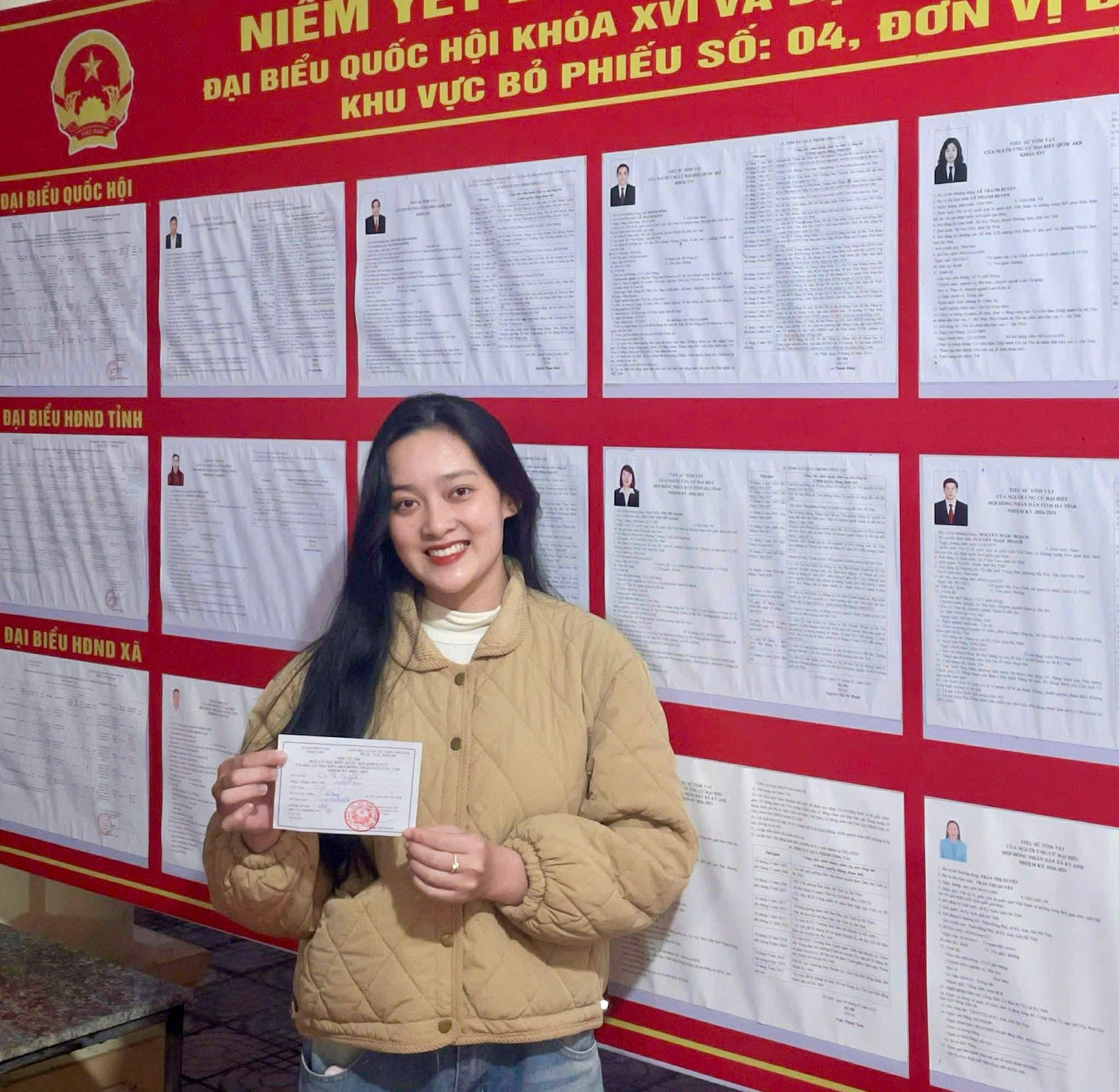 Trong không khí náo nức của ngày hội non sông, Nguyễn Thị Việt Tiên (SN 2003) – hiện đang công tác tại Bệnh viện Đa khoa tỉnh Hà Tĩnh hạnh phúc khi được cầm trên tay tấm thẻ cử tri. Dù bận rộn với công việc chuyên môn tại bệnh viện, Việt Tiên vẫn cố gắng sắp xếp thời gian để thực hiện quyền công dân của mình ngay trong sáng sớm.