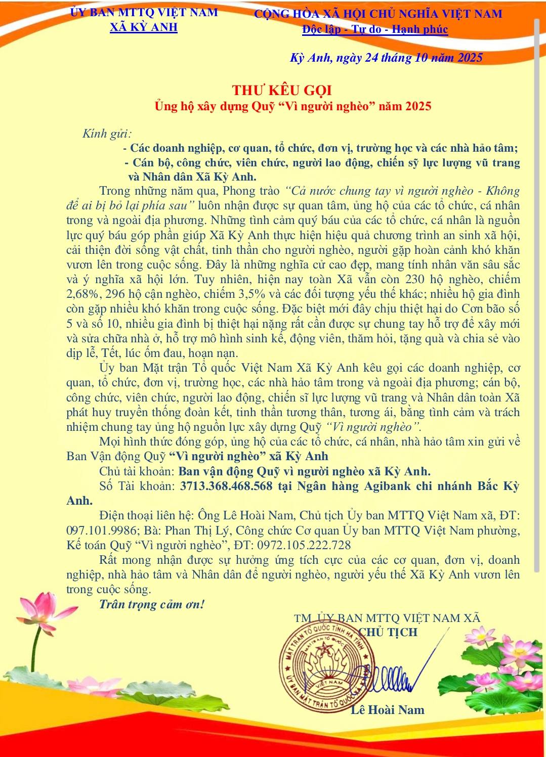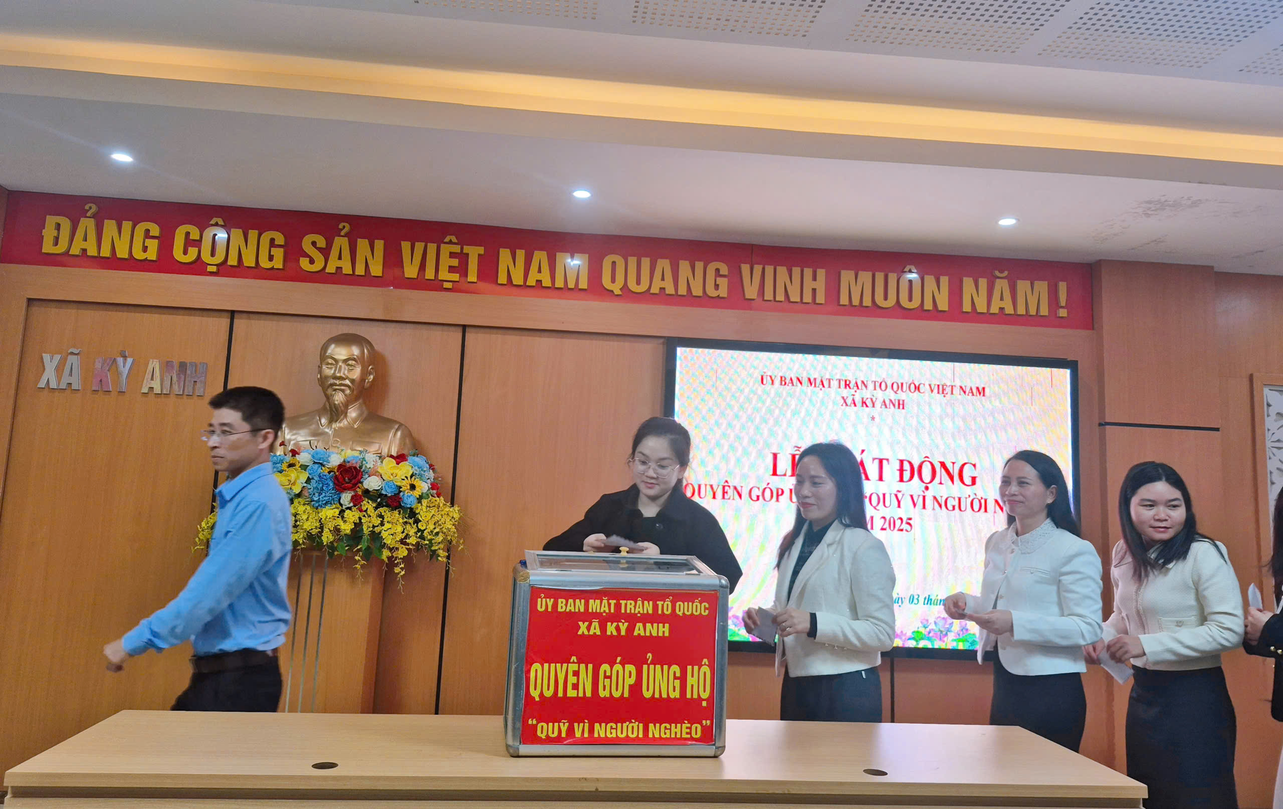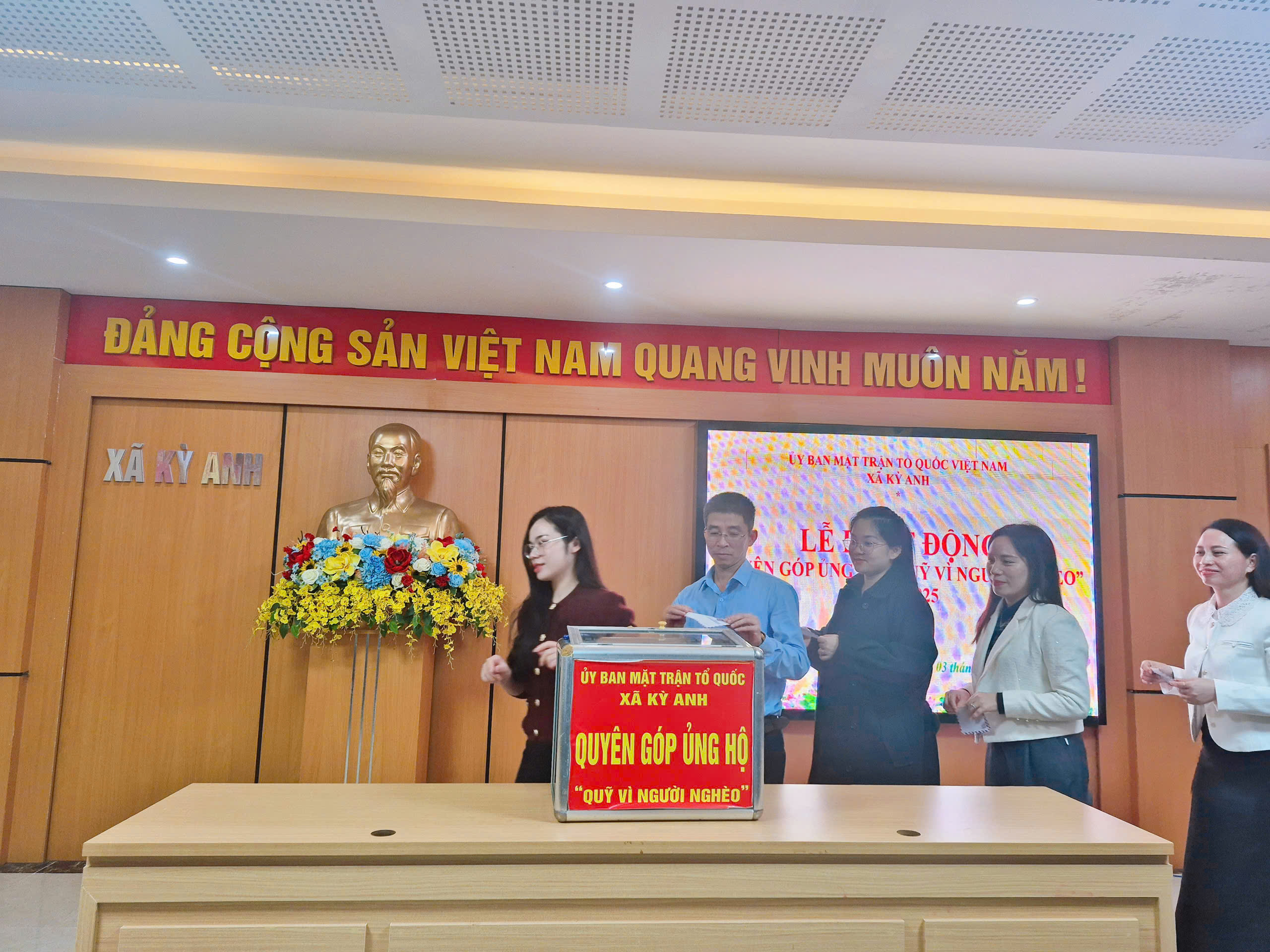 Ủy ban Mặt trận Tổ quốc Việt Nam xã Kỳ Anh kêu gọi các doanh nghiệp, cơ quan, tổ chức, đơn vị, trường học, các nhà hảo tâm trong và ngoài địa phương; cán bộ, công chức, viên chức, người lao động, chiến sĩ lực lượng vũ trang và Nhân dân toàn Xã phát huy truyền thống đoàn kết, tinh thần tương thân, tương ái, bằng tình cảm và trách nhiệm chung tay ủng hộ nguồn lực xây dựng Quỹ “Vì người nghèo”.