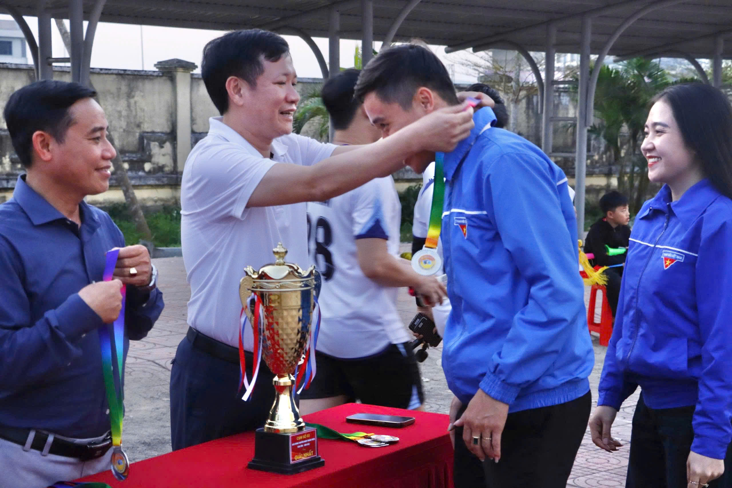 Lãnh đạo xã trao huy chương cho các đội bóng